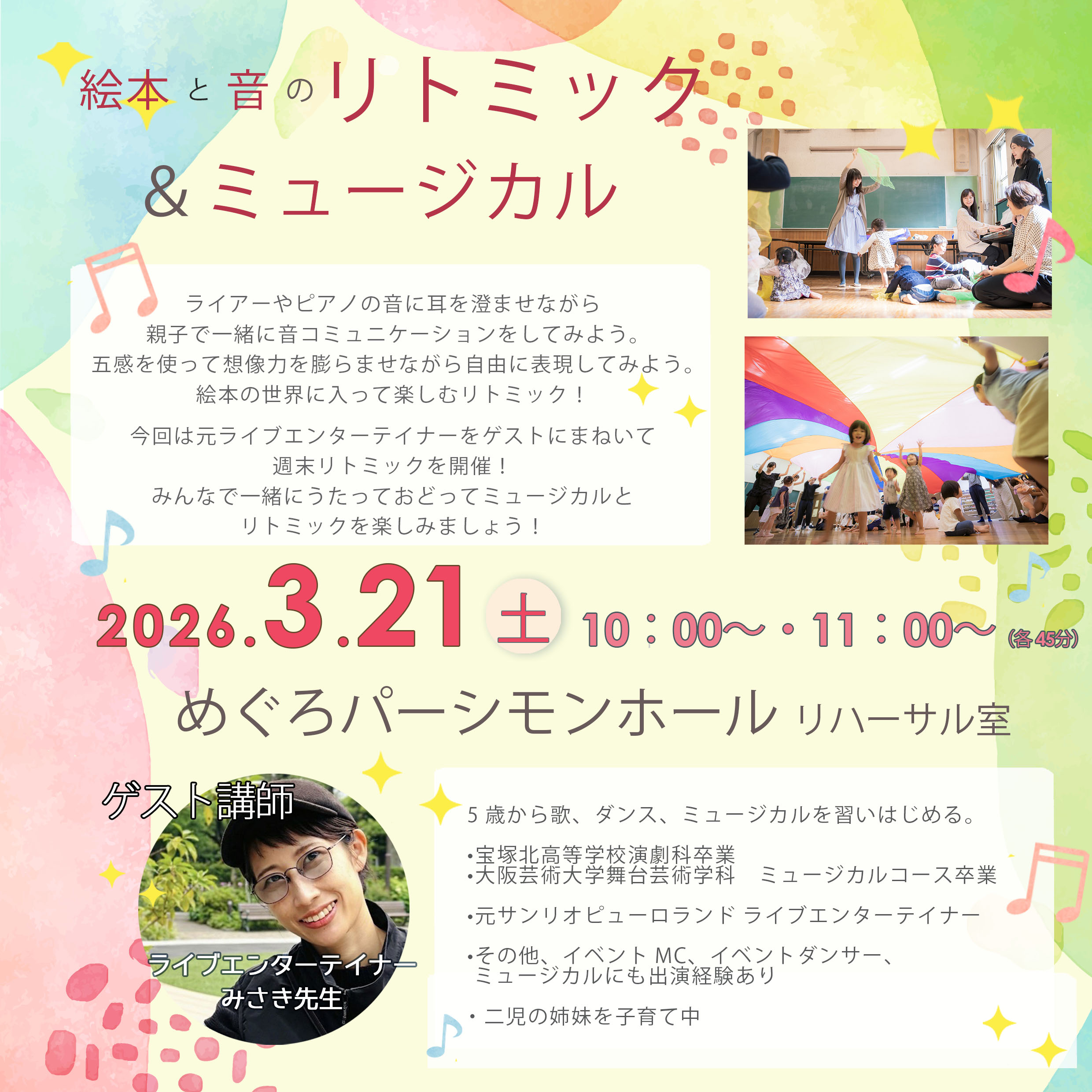 2026年3月 元ライブエンターテイナーさん をゲストにまねいて「ミュージカル」と「リトミック」の週末イベントを行います! 前半は、いつものように楽しく絵本リトミックの世界に浸ります!後半は、うたっておどってのスペシャルミュージカルコーナーを開催!!・ミュージカルって?・みんなでうたっておどってミュージカル体験!・ライブエンターテイナーさんの生ライブ?!などを行う予定です!みんなで見て・聴いて・体験して、ミュージカルの世界に浸っちゃいましょう♪